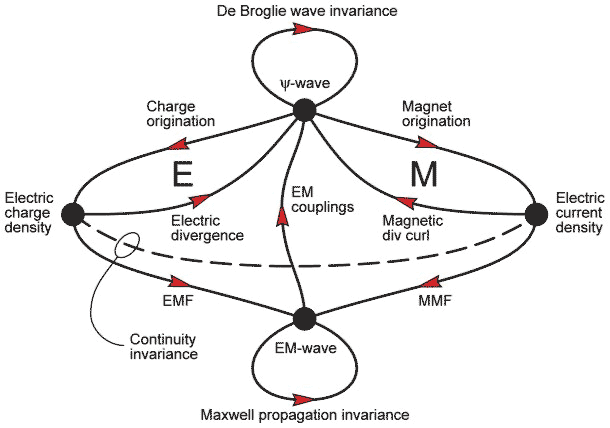 The inner loops marked E and M deal with the dynamics of charge and current regulation. Indeed, it is only the E loop that takes effect in determining the distinctions between the discrete attractor states of different ionic charge distributions. Magnetic quantisation involving loop M is more subtle. The remaining causal paths at the lower part of the diagram are via Maxwellian fields. These latter effects are mainly observable as interactions between separate charge or current bearing entities. The processes supporting inter-atomic molecular bonding lie in the hinterland where either or both of these sorts of causal systems may be involved, the upper loops dominating in what are called valence bonds and the lower loops in ionic bonds.